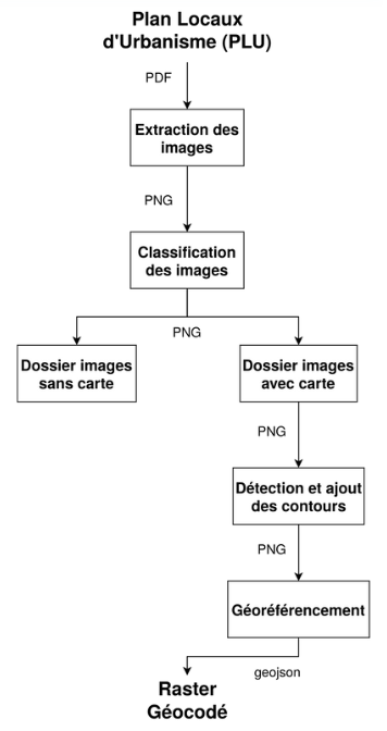 Premièrement, nous avons extrait les images des documents PLU récupérées sur le site Geoportail, en utilisant la librairie Python Fitz, ces images contiennent des cartes mais aussi des graphiques, des photos ou encore des documents. Il fallait donc commencer par classifier les cartes.